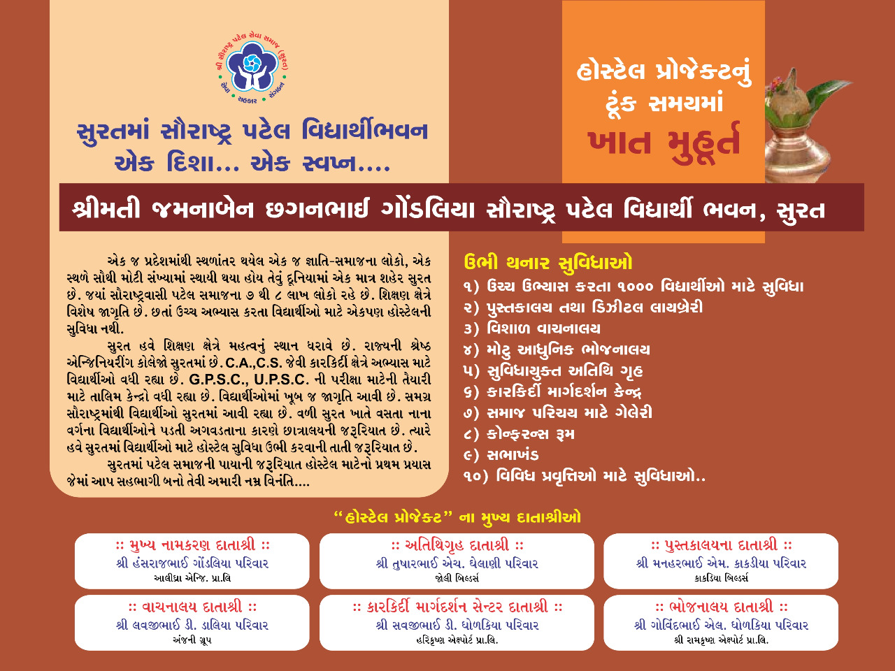 સુરતમાં પટેલ સમાજની પાયાની જરૂરિયાત હોસ્ટેલ માટેનો પ્રથમ પ્રયાસ, જેમાં આપ સહભાગી બનો એવી અમારી નમ્ર વિનંતી